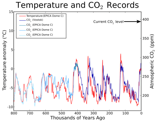 This figure shows historical CO2 (right axis) and reconstructed temperature (as a difference from the mean temperature for the last 100 years on the left axis). Records based on Antarctic ice cores, providing data for the last 800,000 years.